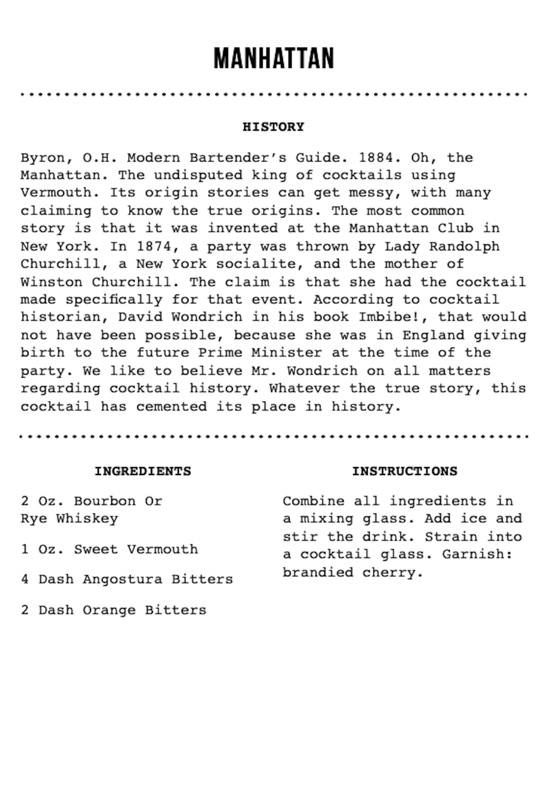 While many claim to know its true origins, the Manhattan is most commonly said to have been invented at the Manhattan Club in New York in 1874. This cocktail was made for a party thrown by New York socialite, Lady Randolph Churchill, but history has her placed in England at the time. Whatever the true story, this cocktail has cemented its place in history.